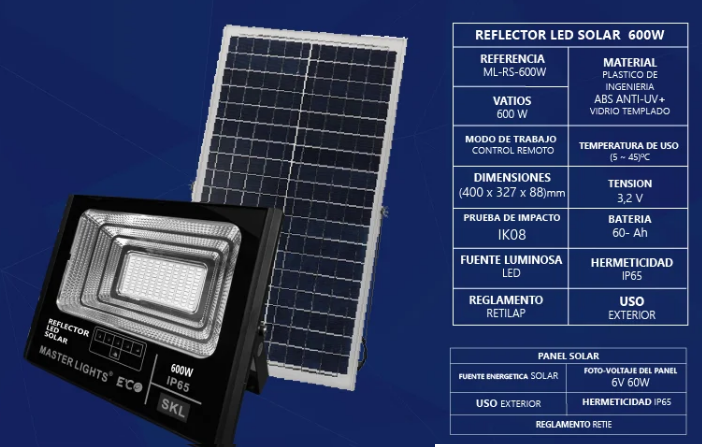 Reflector solar LED de 60W con panel solar y batería recargable, ideal para exteriores. Ofrece hasta 12 horas de iluminación automática con sensor crepuscular y control remoto. Resistente al agua (IP65) y de fácil instalación.
